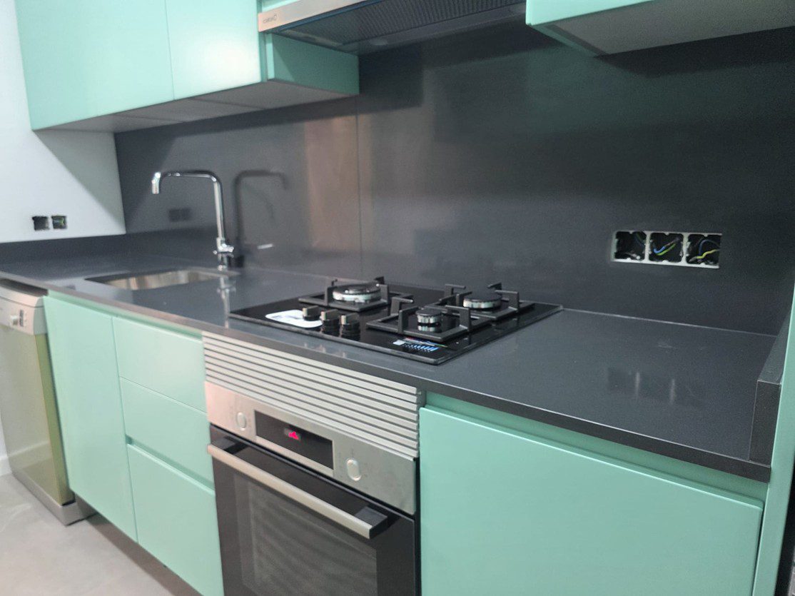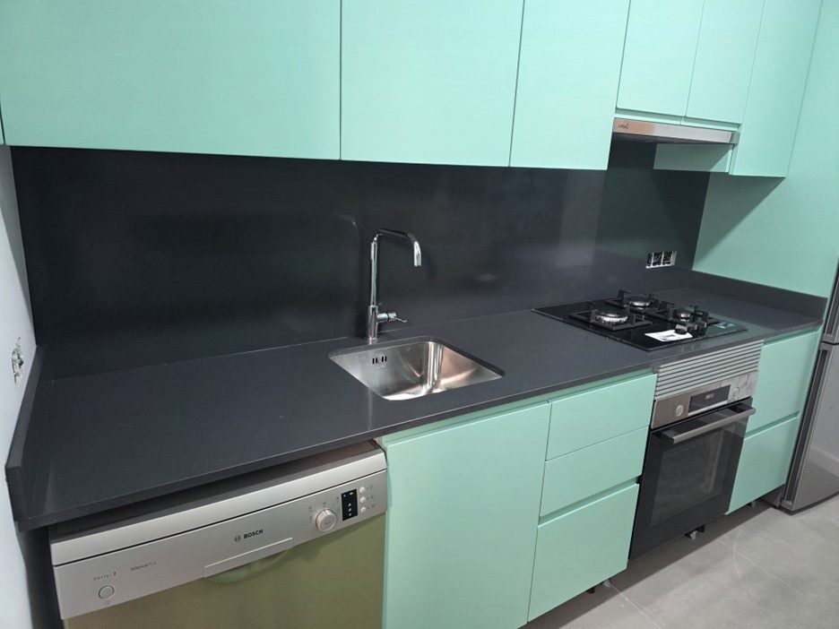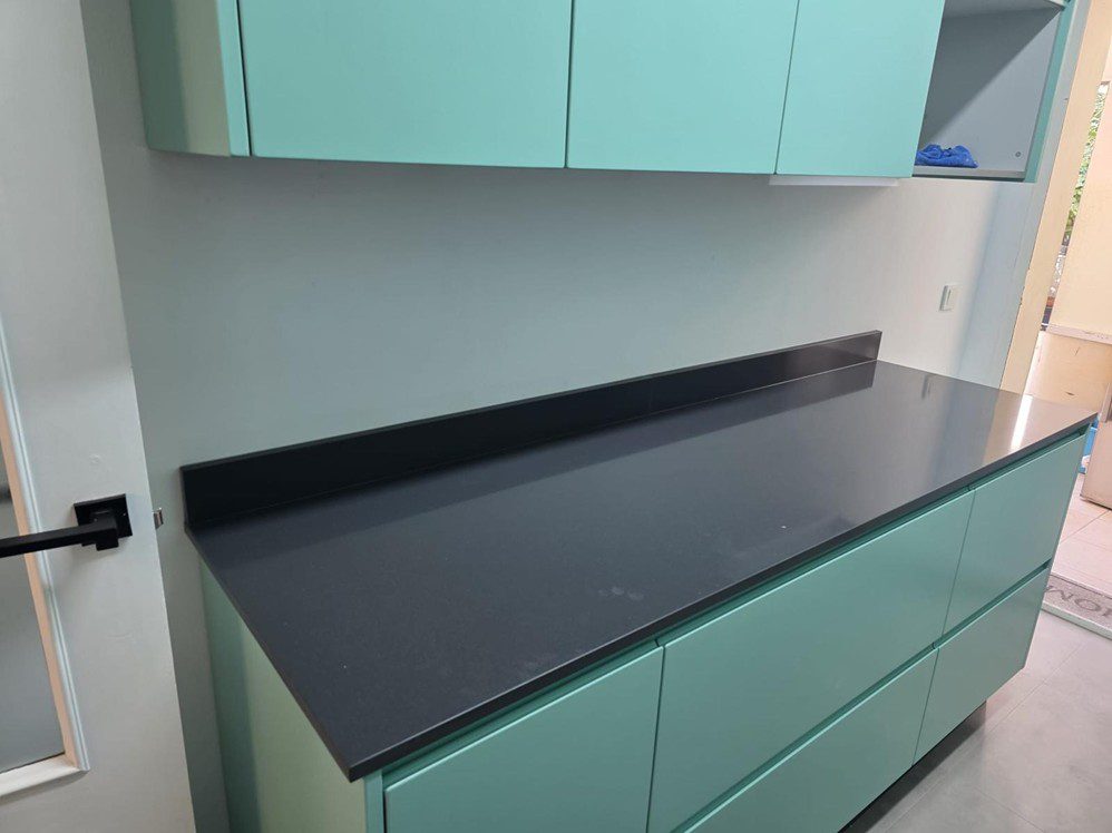 El acabado en gris oscuro o negro aporta un toque de elegancia, sofisticación y profundidad al diseño de la cocina, y contrasta muy bien con los muebles en tonos claros o vivos, como el verde agua de la imagen.