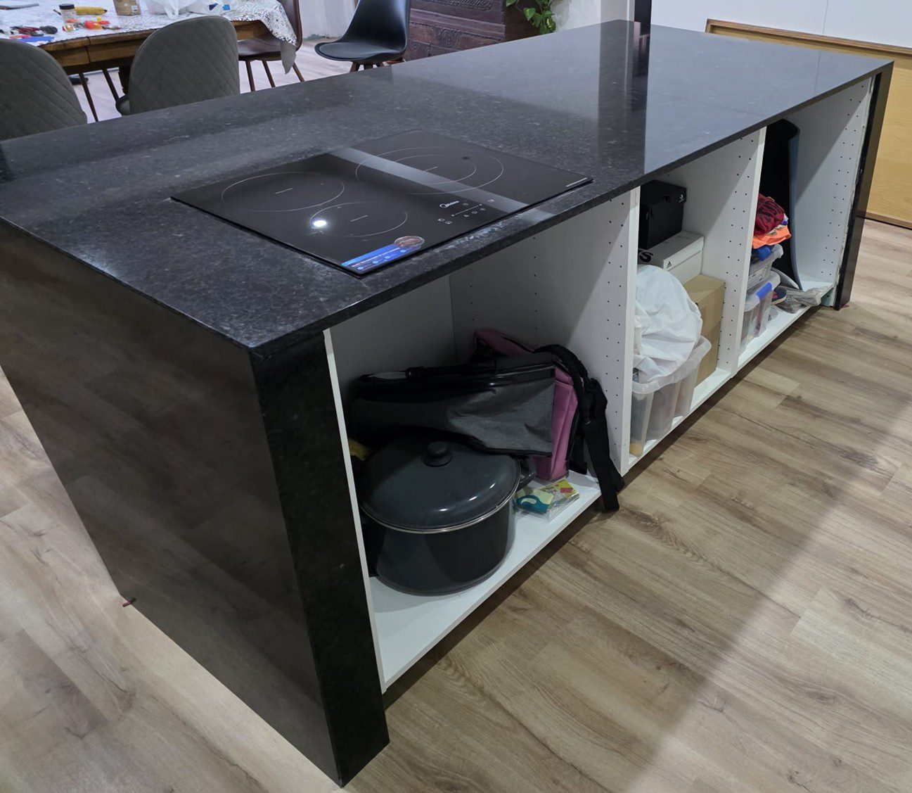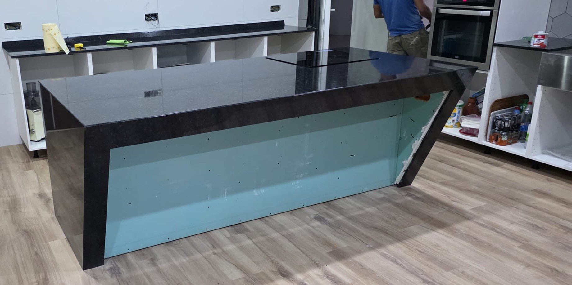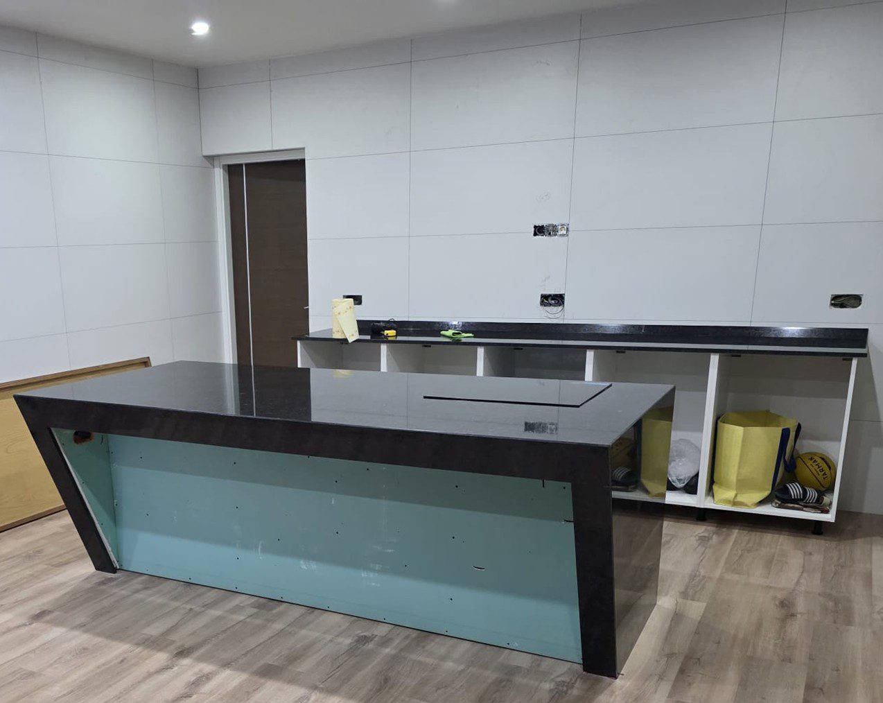 Esta encimera destaca por su elegante acabado en granito negro angola, Su instalación combina una imponente barra central tipo isla, con caída lateral en forma de “waterfall”, y una encimera lineal en la pared que actúa como barra y superficie de trabajo, creando un espacio moderno, funcional y de gran impacto visual.