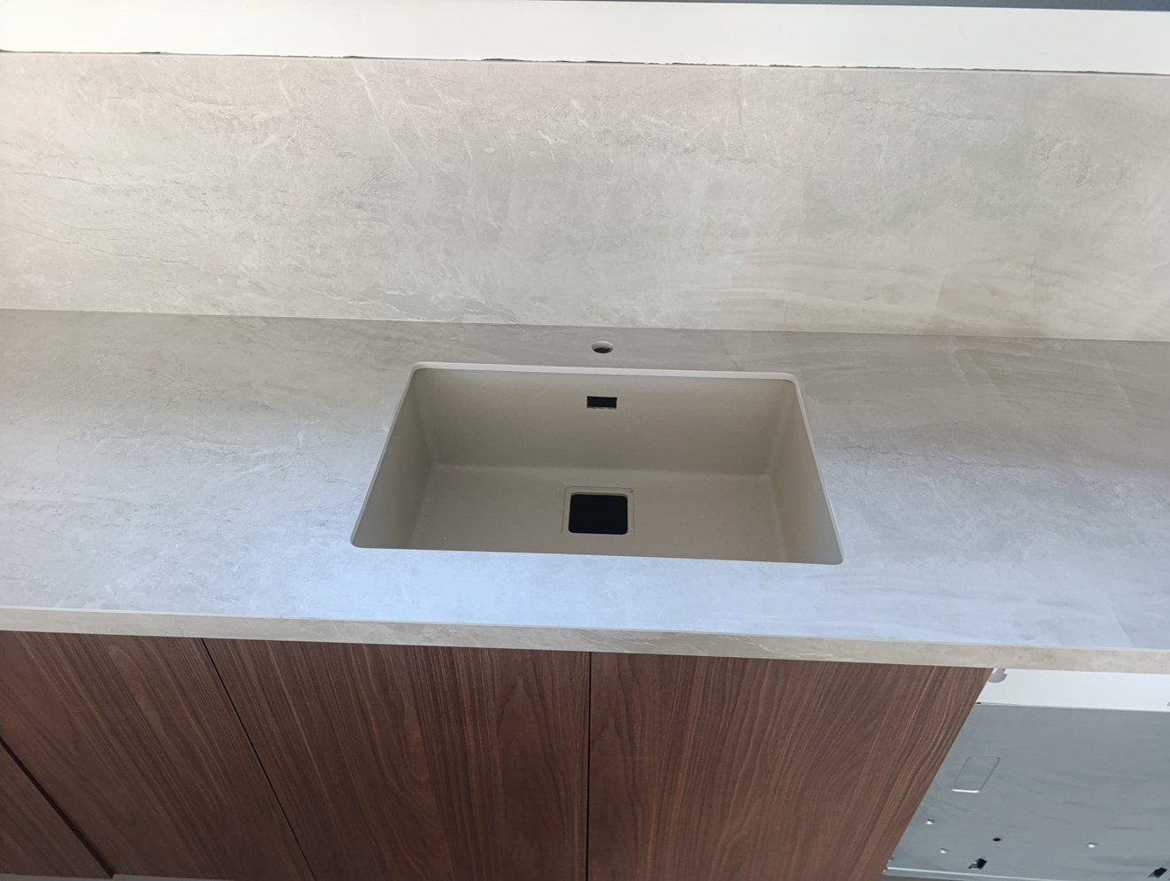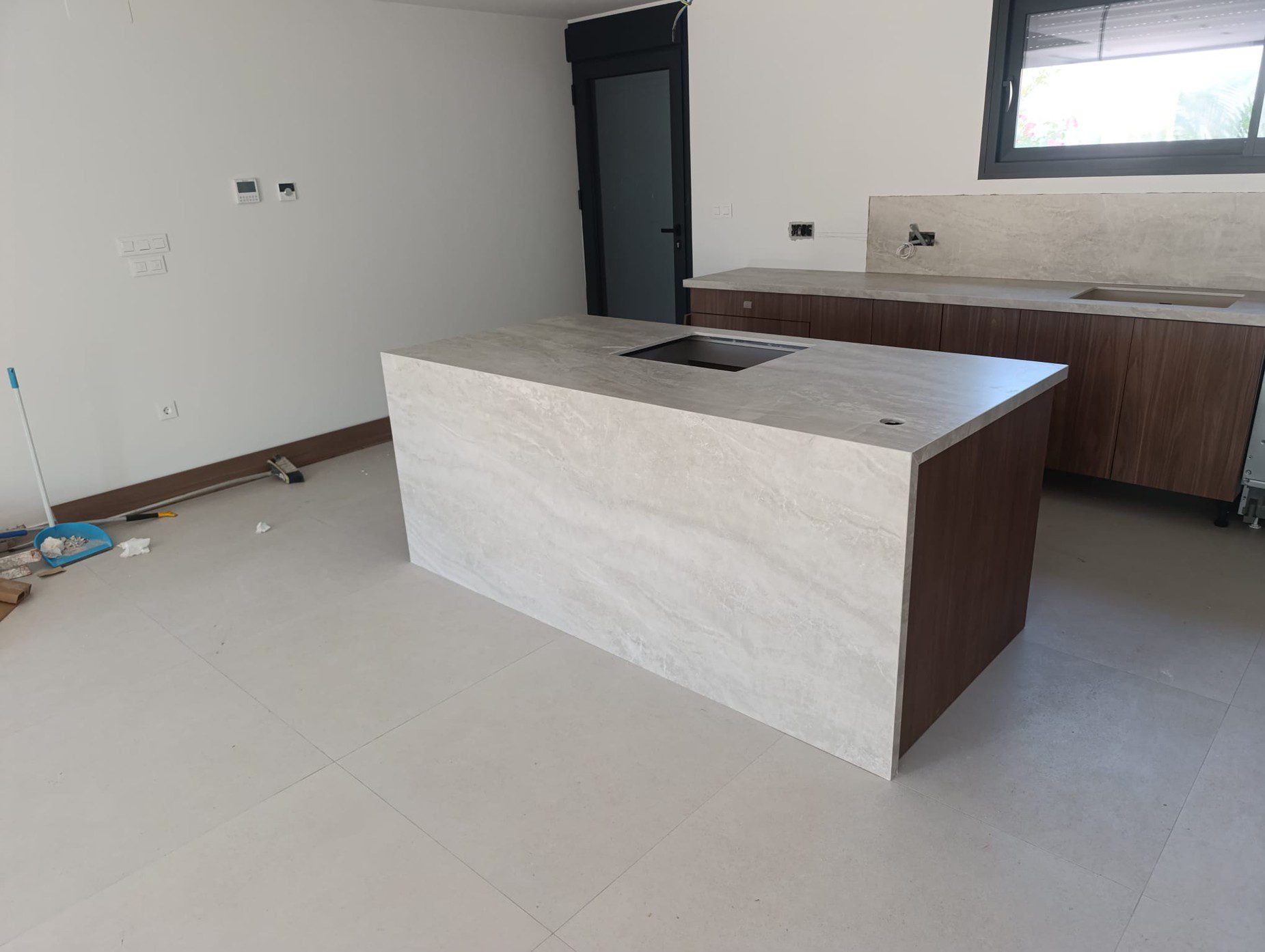 Esta elegante encimera está fabricada en porcelánico taj mahal con canto ingletado en 4cm con fregadero bajo encimera , con un acabado que reproduce de manera realista las vetas suaves y los matices característicos de la piedra natural en tonos beige y crema. Su diseño moderno incluye una isla central revestida íntegramente, creando un bloque visualmente limpio y sofisticado que se convierte en el punto focal de la cocina. Alta resistencia al calor y a las manchas, ideal para el uso diario.
